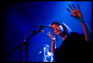 Na de gezamenlijke introductie waren Yoko en Arker de eersten die mochten spelen. Ik was meteen van mijn onbeschrevenheid verlost. Julie heeft een prachtige breekbare stem, maar zonder de eindeloze melancholie van pakweg Beth Gibbons. De muziek die ze met Arker maakt is rustige pop; het nummer ‘My Sole Wish’ paste nog het best in dat triphopkleedje. Een beetje nazomer met een bevreemdende avondgloed. Zeker het ontdekken waard voor wie meisjes uit Scandinavië kan smaken.